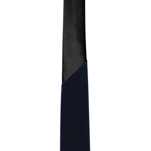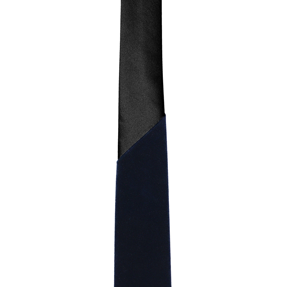 The point on a navy velvet tie that the material and collar switches to black satin material for easier tying