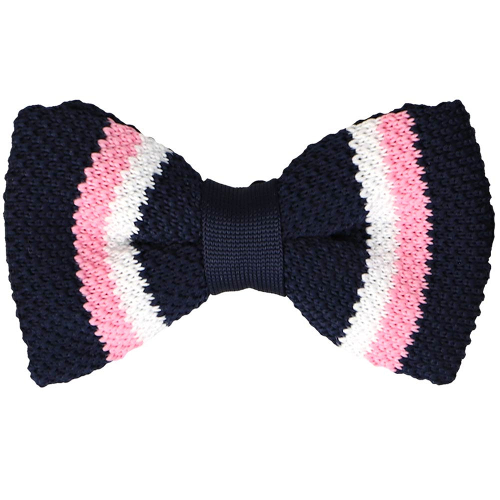Exclusively ours! For a cool and casual look, try this navy blue, bold striped knit bow tie. This men's bow tie is knit from 100% polyester and has a pre-tied band collar that adjusts for neck sizes up to 19-inches. Features pink and white vertical stripes.