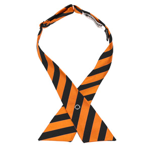 This orange and black striped crossover tie is designed to coordinate with our line of striped ties. At a half-inch wide, the stripes are a slightly smaller width than our men's striped ties. Stays securely in place with a white, open ring snap and adjusts to fit neck sizes up to 17-inches.