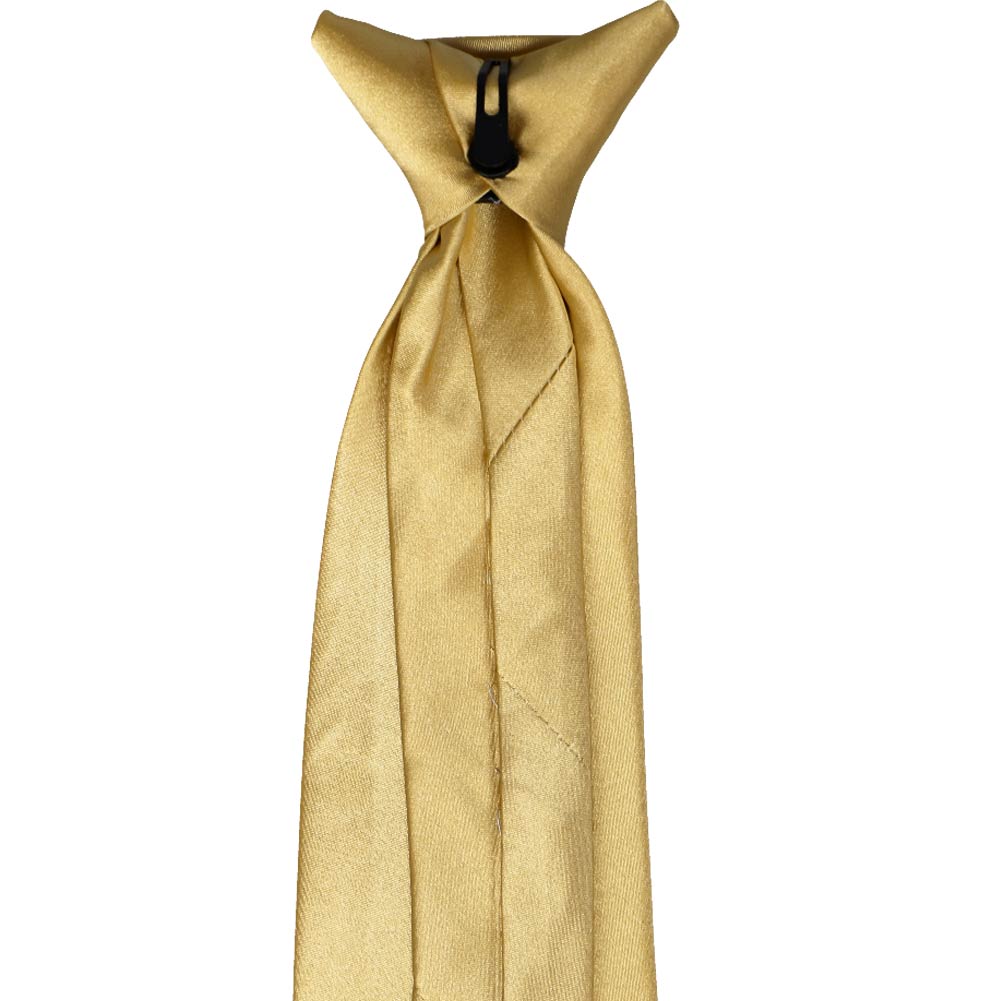 This pale gold clip-on tie features a pre-tied knot for easy use. It's made of durable, 100% polyester with a satin finish and available in two lengths for men, women and teens. This tie is popular for individual use, but the pre-tied style makes it a favorite for large group or staff attire.