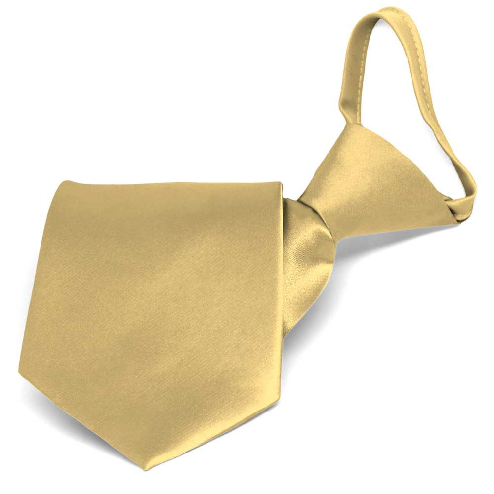 This pale gold solid color zipper tie is pre-tied and easy to use. When worn, it will look like a standard necktie. However, a zipper in the tie tail allows the collar to quickly expand and fit over the head without having to tie a knot. Available in a men's 20-inch length, as well as a 17-inch length that is ideal for women, teens or shorter men. These pre-tied ties are popular for individual use, but are also great for creating a uniform look among your group or staff. Add a matching pocket square for a refined look.