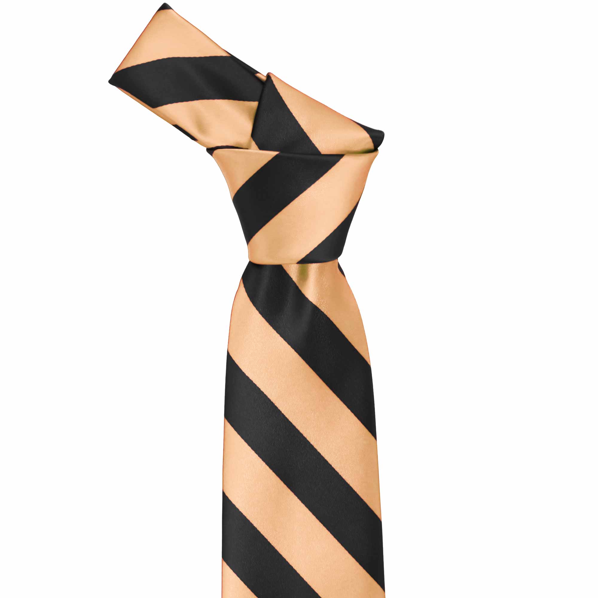 This peach and black striped necktie is popular for weddings and everyday attire. The unique color palette is subdued, making it the perfect choice for a spring wedding or softer office style. The stripes are a collegiate size at 0.75-inches wide. We like this one with a black suit to make those black stripes pop.