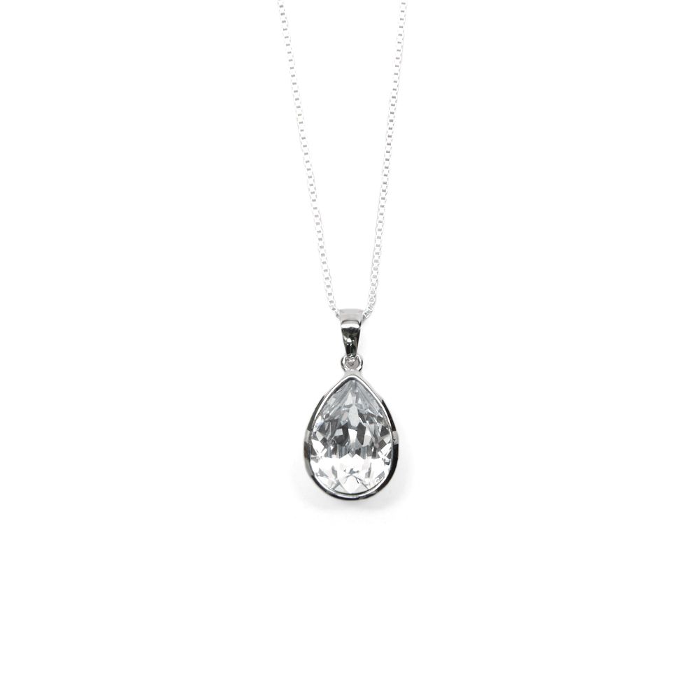 Perfect for weddings! Coordinate your bridesmaid's necklaces and groomsmen's ties with these simple, yet elegant necklaces. The pear shaped pendant is made with Swarovski® crystals and includes a sterling silver venetian chain. The crystal is colorless, so it pairs with any of our ties. Each necklace has a unique code that can be entered at www.swarovski.com/crystals to verify the authenticity of the crystal.