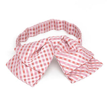 Exclusively ours! A pre-tied, floppy bow tie in a stylish pink, coral and white gingham-like plaid design. The band collar adjusts to fit most men and women. Suited for matching women's uniform wear or men's vintage-inspired attire.