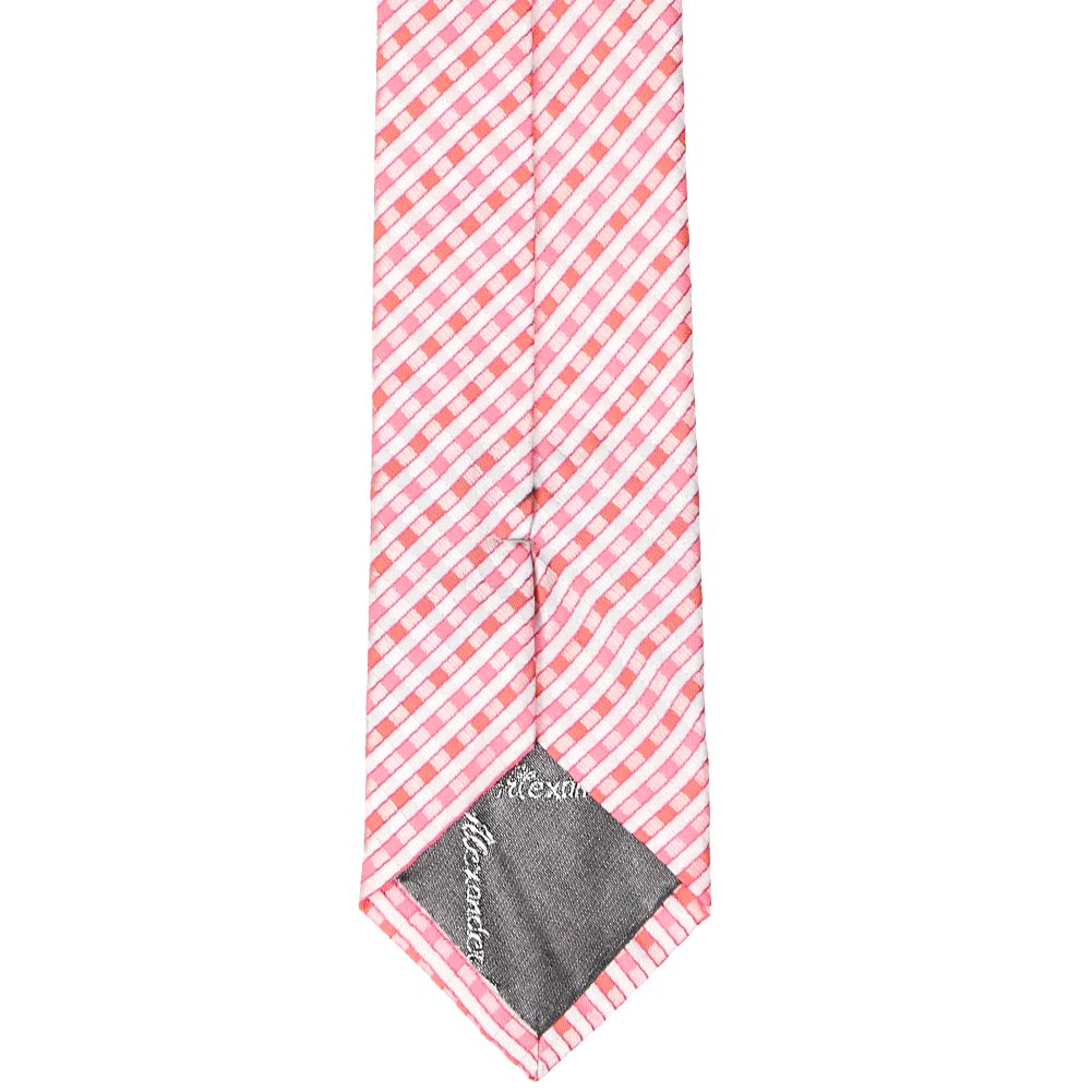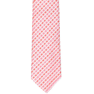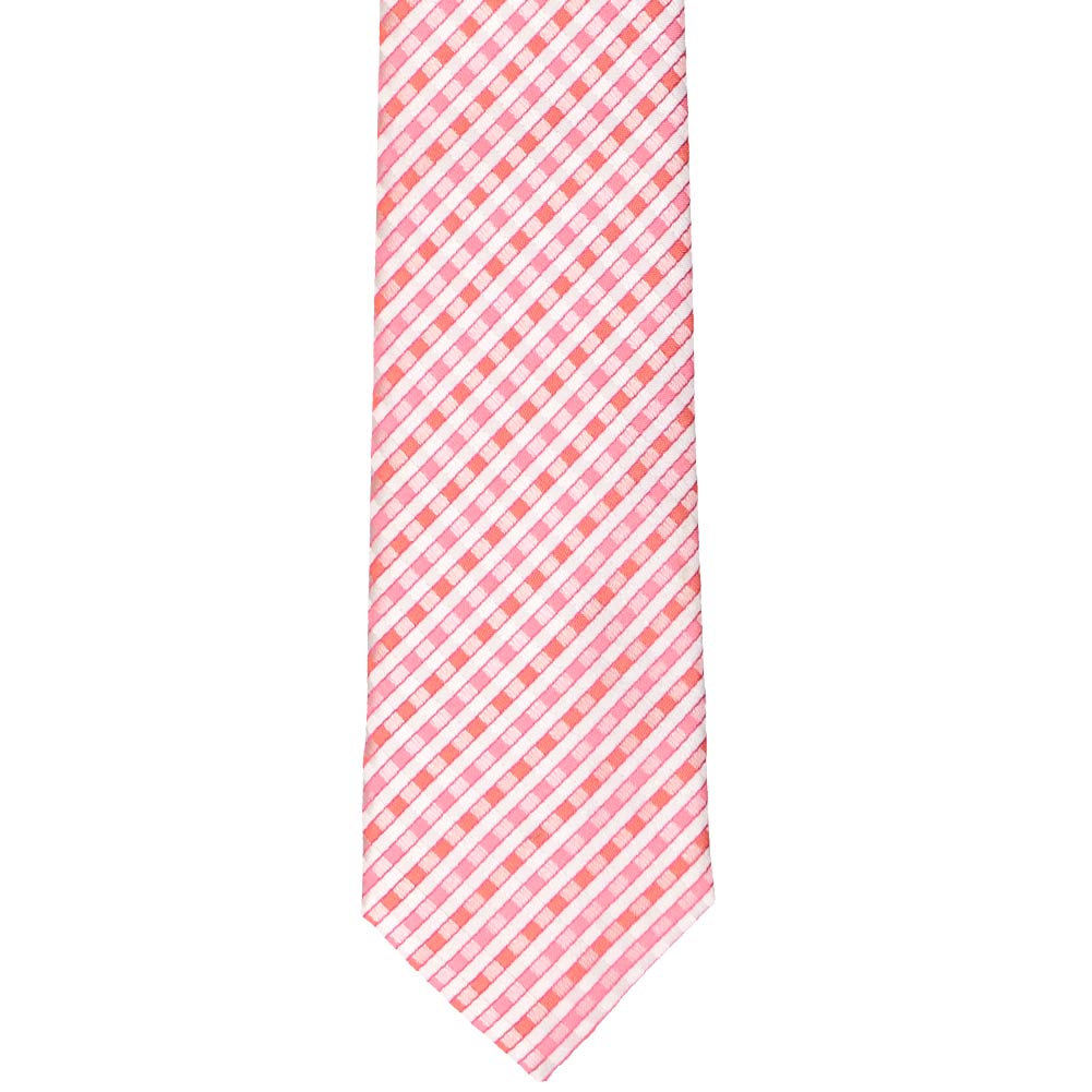 Celebrate in style with this charming pink, coral, and white gingham plaid tie. The slim cut and soft pink hues make it a perfect choice for your wedding day, effortlessly complementing the bridal party. Whether you're outfitting your groomsmen in navy or gray suits, or going for a more laid-back look with suspenders and slacks, this tie adds the perfect touch of warmth and personality. Plus, we offer sizes for the ring bearer, so everyone can match!