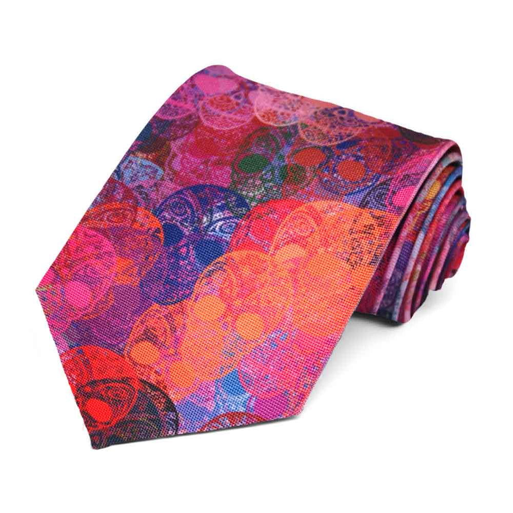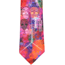 A pink and assorted color sugar skull necktie, laid out flat