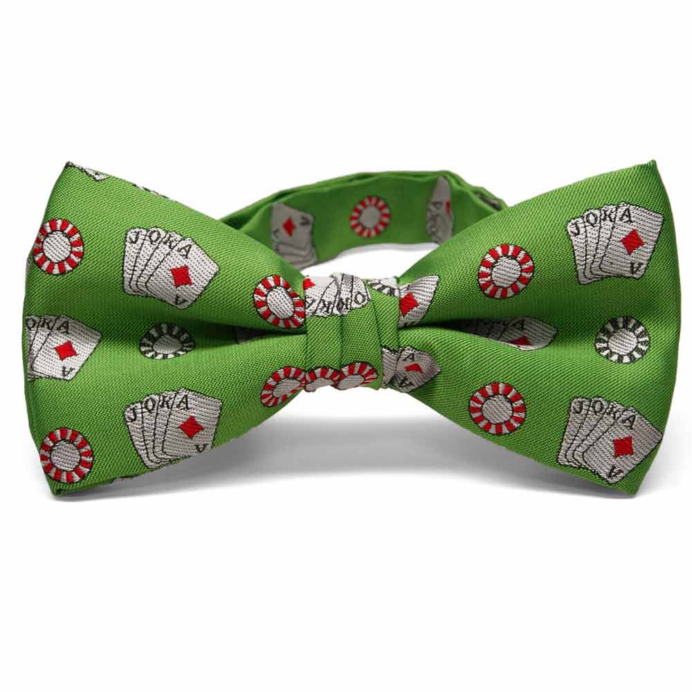 No need for a poker face, this bow tie was made for showing off your hand! This lucky bow tie features poker chips and playing cards on a bright green background. Makes a great gift for the game-night host or wear it to the casino for a night of gambling. From black to tan, this green bow tie really goes with any suit color, but can be worn casually with shirts and slacks, as well.
