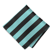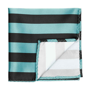 This pool and black striped pocket square measures a large, 12-inches by 12-inches to suit a wide variety of folds. The tightly woven material creates a smooth finish for a sharp look. Matching ties available for purchase.