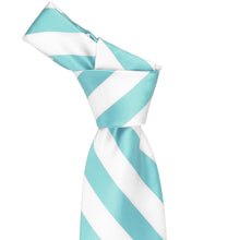 This pool blue and white striped necktie is popular for wedding parties and everyday wear. The light colors are just what you want for spring and summer attire. The best part? This versatile tie can be worn with any color suit thanks to the subdued blue shade. For formal occasions, consider adding a solid color pocket square in pool or white to offset the striped tie. (Pocket squares sold separately.)