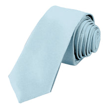 This powder blue skinny tie is one that can be worn anywhere. The light blue color is a popular choice for weddings and other formal events. It's cut to our skinniest, 2-inch width with a standard men's length. The material is heavyweight woven polyester with a light satin finish, so it's not too shiny, not too dull. Matching pocket squares and more sizes and styles in this color.