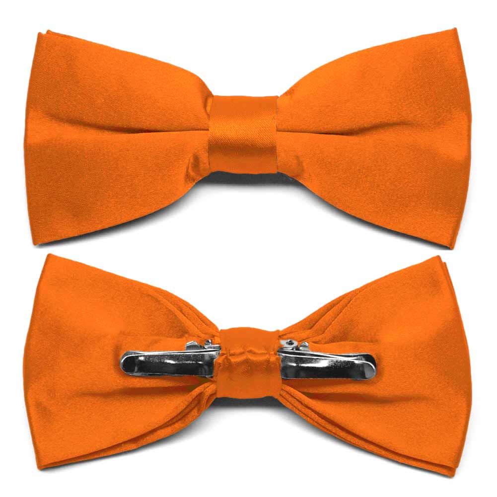 Wear a perfect bow every time with this pumpkin orange clip-on bow tie. This pre-tied bow tie features a heavyweight clip that discretely attaches to either side of your shirt collar material for a secure fit. One size fits all, regardless of neck size. Has a shiny, satin look. Matching pocket squares available.