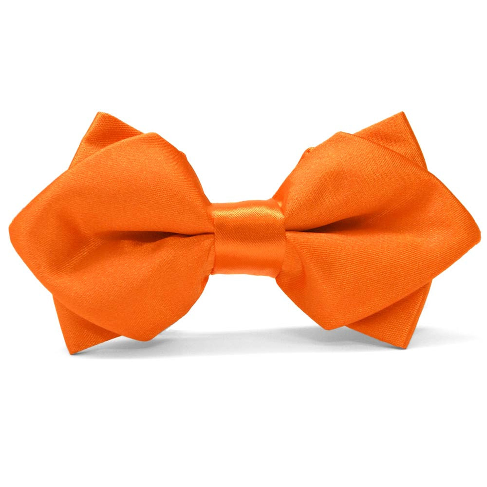 This pumpkin orange diamond tip bow tie is fun and handsome. It features diamond tips in the front and traditional bow tips in the back. It has an adjustable band that expands to fit neck sizes from 12 to 21-inches and securely attaches around the neck. Shiny, satin look. See related products below for matching pocket squares, boys' ties and scarves.