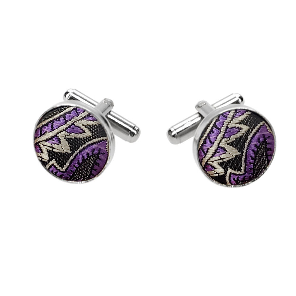 These purple and gray paisley cufflinks will amplify your outfit. The pattern is made of fabric while the rim and backing are a silver-tone. Easy to match to your wardrobe and simple to put on. Wear these to work, for your wedding day or give them as a gift.