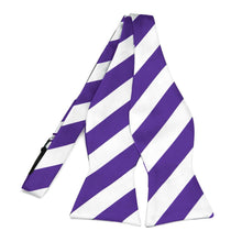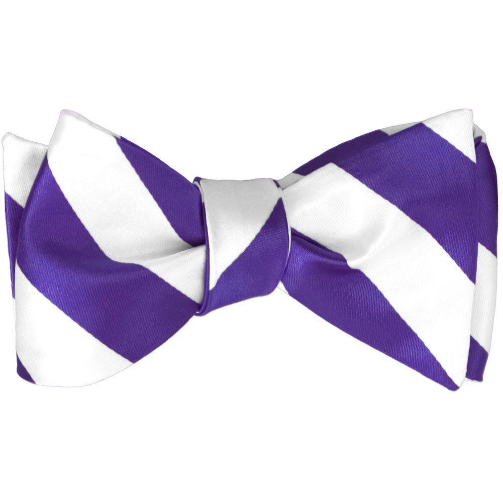 This classic purple and white striped self-tie bow tie measures approximately 4-inches across by 2.5-inches high when tied. The adjustable neck fits sizes from 13.75 to 20-inches. Made from all polyester microfiber, it is designed to match our bestselling men's purple and white striped tie. Matching pocket squares are available for purchase.