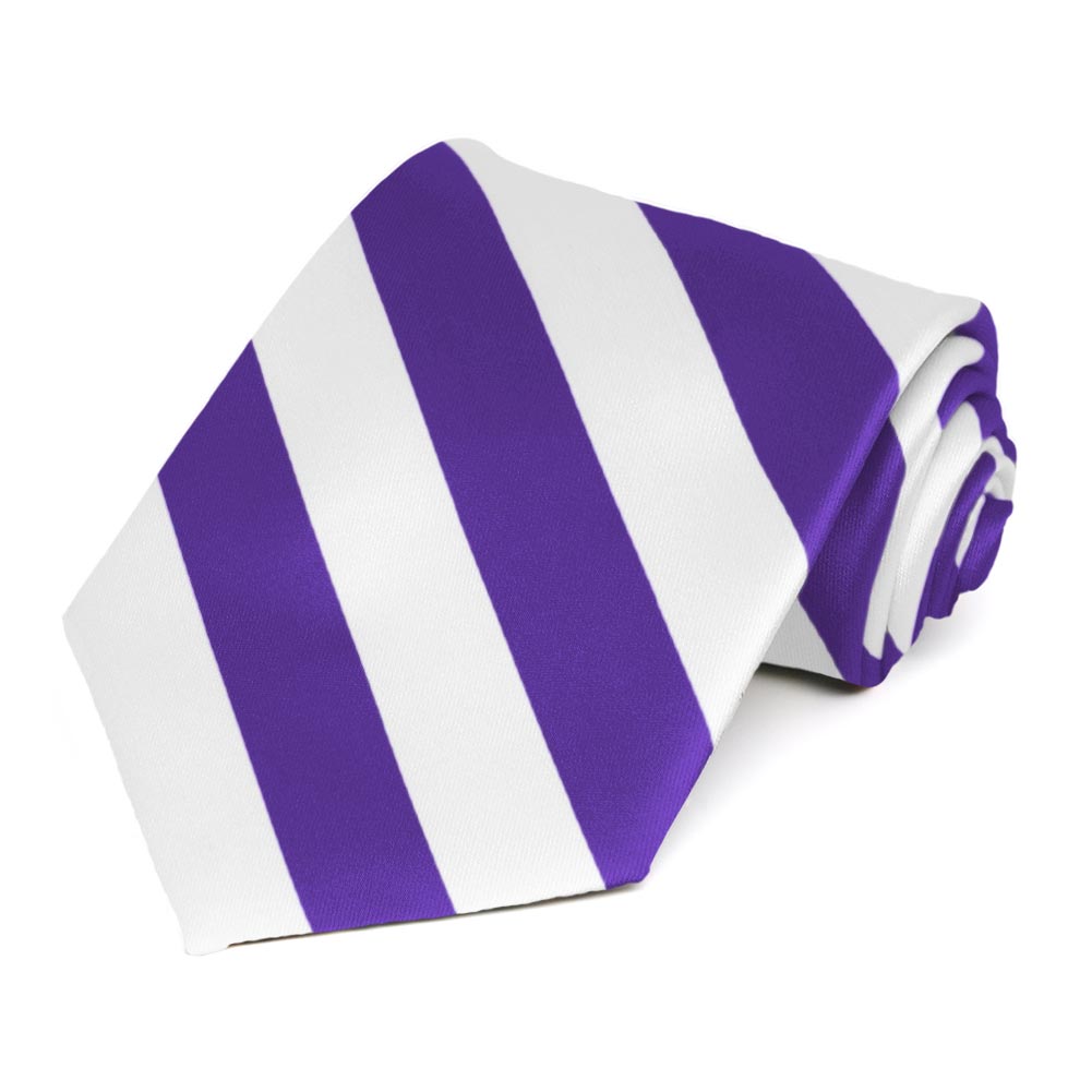 Celebrate your team's big win in this purple and white striped tie. The stripes are just the right width at 0.75-inches, not too wide or too narrow. Whether you're heading to work, school or a sports award banquet, you'll look sharp when you pair this tie with a navy blue or black suit and the matching pocket square (available for purchase).