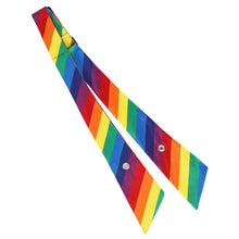 Make a statement in this fun and colorful rainbow striped crossover tie. Crossover ties are a popular uniform item. This one will look great on a large group or staff, but it can definitely be worn instead of a bow tie, as well. This crossover tie stays securely in place with a silver open ring snap and adjusts to fit neck sizes up to 17-inches. It can be worn with the ends flat or pointed down.