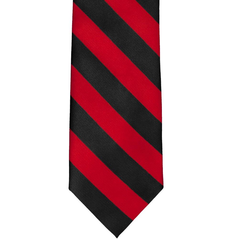 Support your school or cheer on your favorite team with a red and black striped tie. It's pre-tied and easy to use, but when worn it will look just like a standard necktie. The secret is a zipper in the tie tail that allows the collar to quickly expand and fit over the head without having to tie a knot. Available in a standard men's 20-inch length or 17-inch length for shorter men, women and teens.