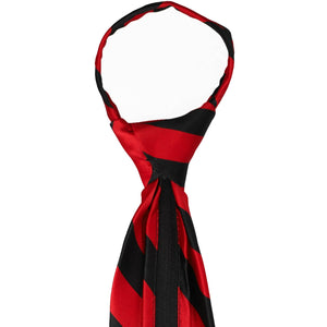 A closeup of the knot on a red and black striped zipper tie