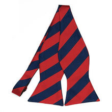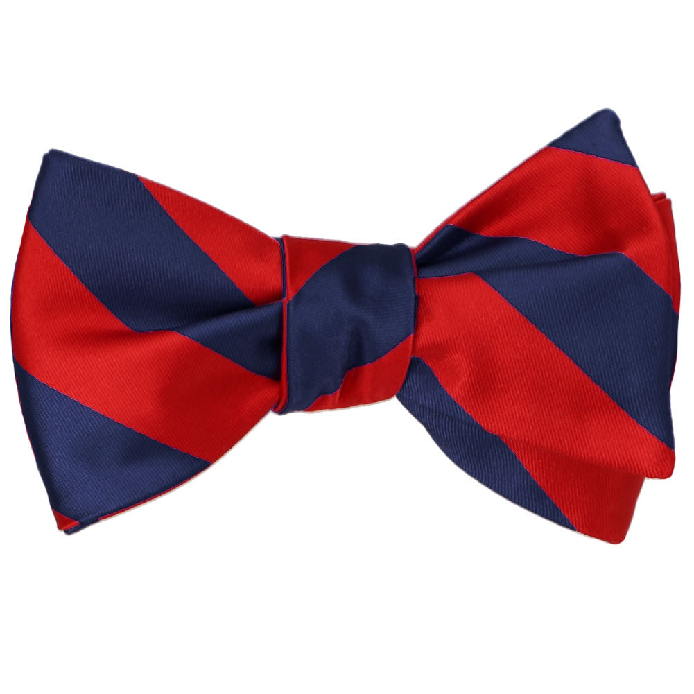 This classic, red and navy blue striped self-tie bow tie measures approximately 4-inches across by 2.5-inches high when tied. The adjustable neck fits sizes from 13.75 to 20-inches. Made from all polyester microfiber, it is designed to match our bestselling men's red and navy blue striped tie. Matching pocket squares available for purchase.