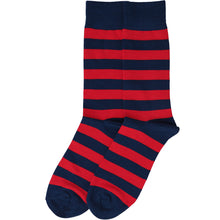 Up your sock game with this pair of men's red and navy blue striped socks. These dress socks can be worn in business settings or as part of your everyday look. The colors just so happen to be popular school, company and sports team colors, so you can show where you stand when you wear these socks.