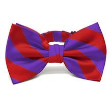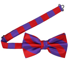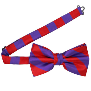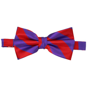 This red and purple striped bow tie features a pre-tied, band collar that expands to fit neck sizes up to 19-inches. Made from all polyester microfiber, it is designed to match our bestselling men's red and purple striped tie and skinny tie. Matching pocket squares and neckties available are available for purchase.