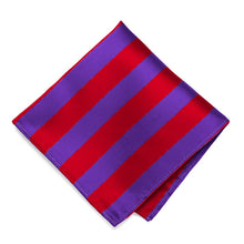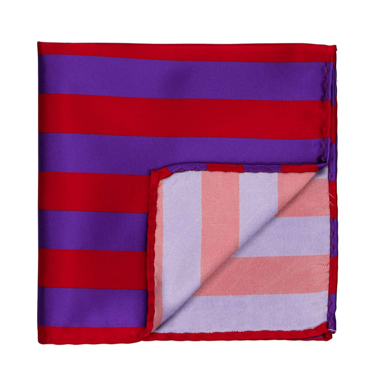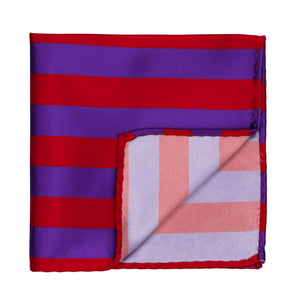 This red and purple striped pocket square measures a large, 12-inches by 12-inches to suit a wide variety of folds. The tightly woven material creates a smooth finish for a sharp look. Matches our red and purple striped ties and bow ties.