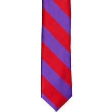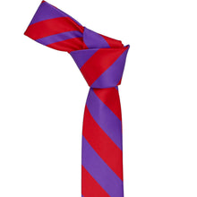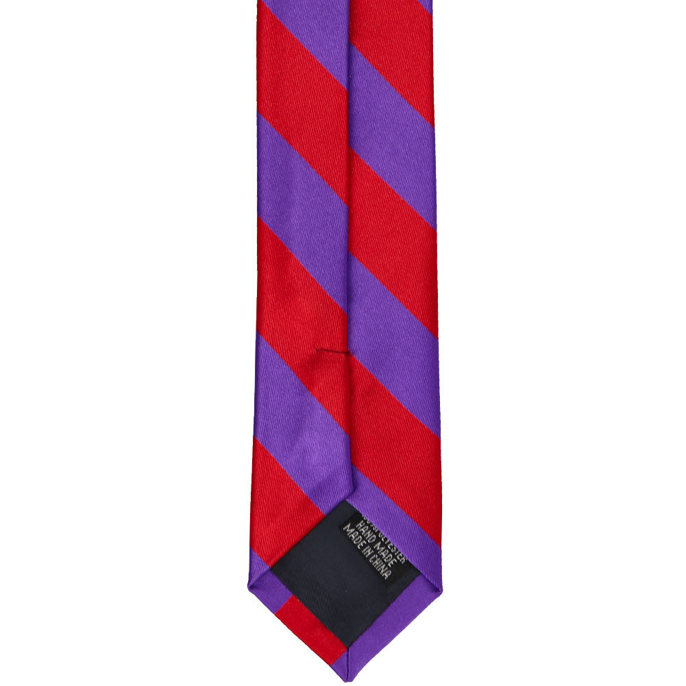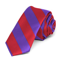 Our most popular striped ties are now available in a trendy, 2-inch width. This skinny red and purple striped tie is made from heavyweight woven material with a smooth, satin finish. Look for this color combo in a men's traditional-width necktie.
