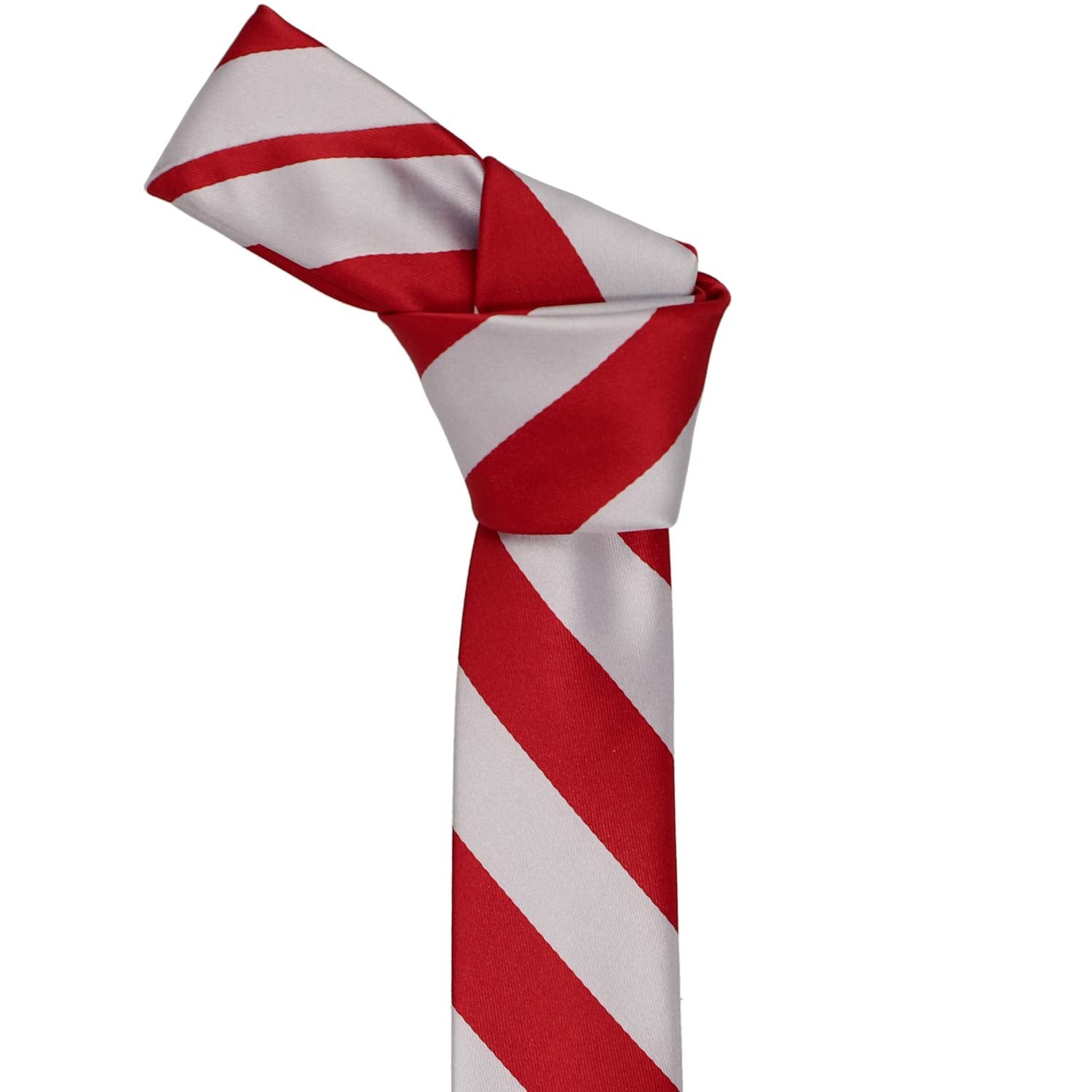 Our most popular striped ties are now available in a trendy, 2-inch width. This skinny red and silver striped tie is made from heavyweight woven material with a smooth, satin finish. Look for this color combo in a men's traditional-width necktie, bow tie, pocket square and boys' tie.