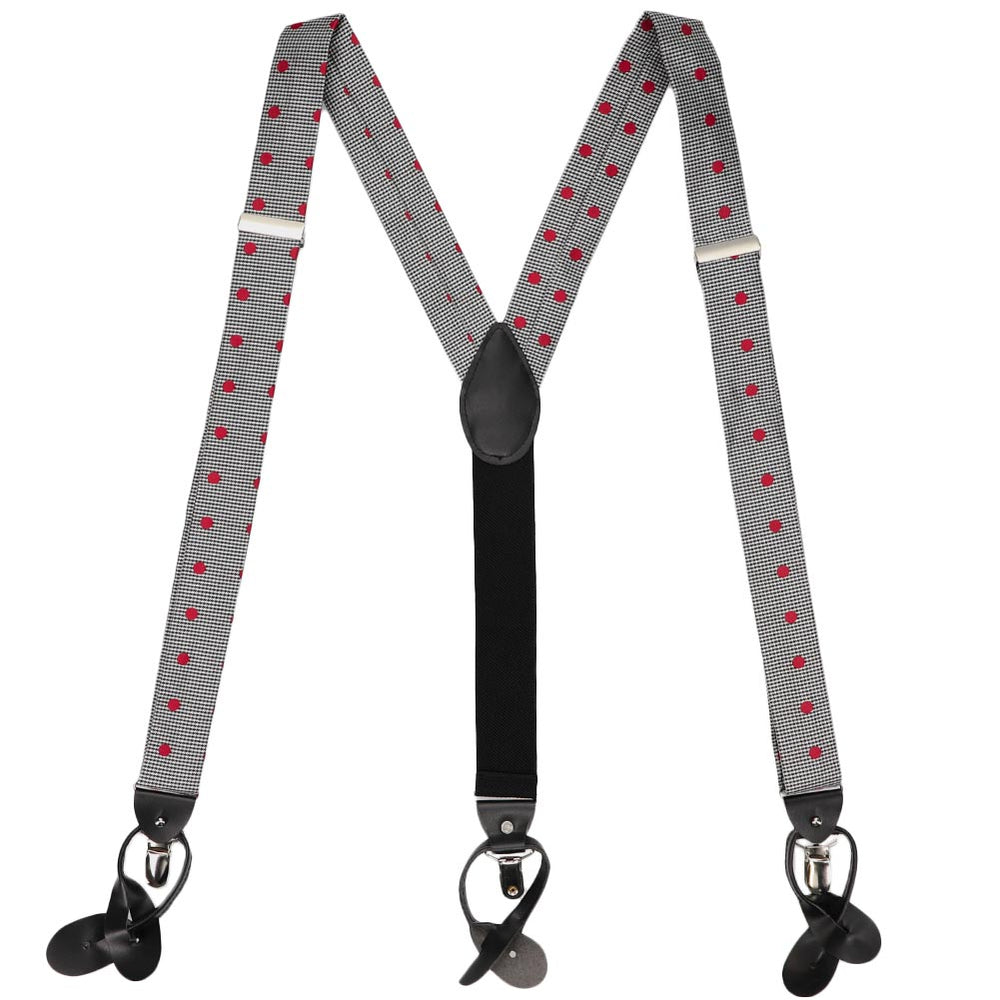 From sport coats to chef pants, the distinctive broken-checkered pattern of houndstooth is a classic fashion staple. We added red dots to the pattern for a fun bit of color. These classic suspenders will stay in style for years to come and can be worn with dressy attire or to the office.