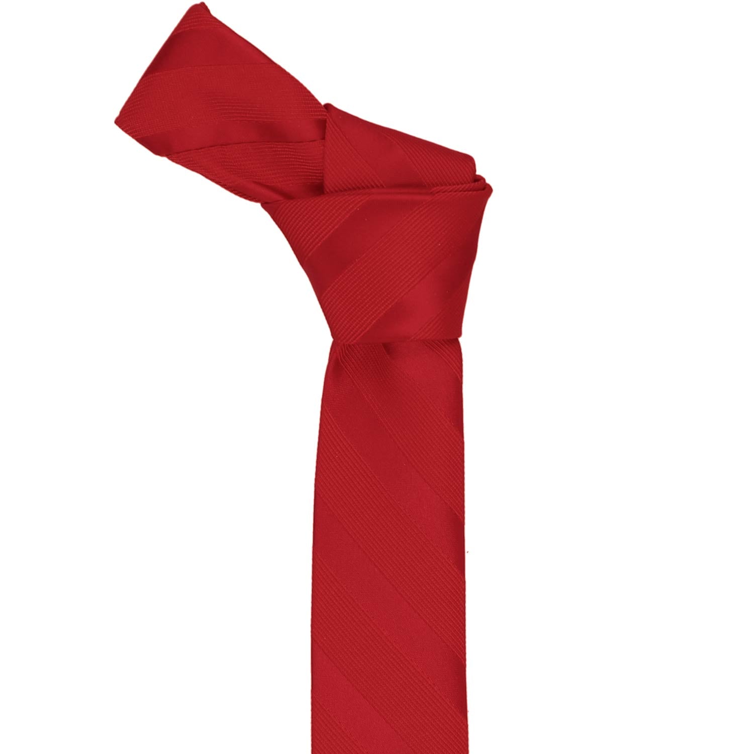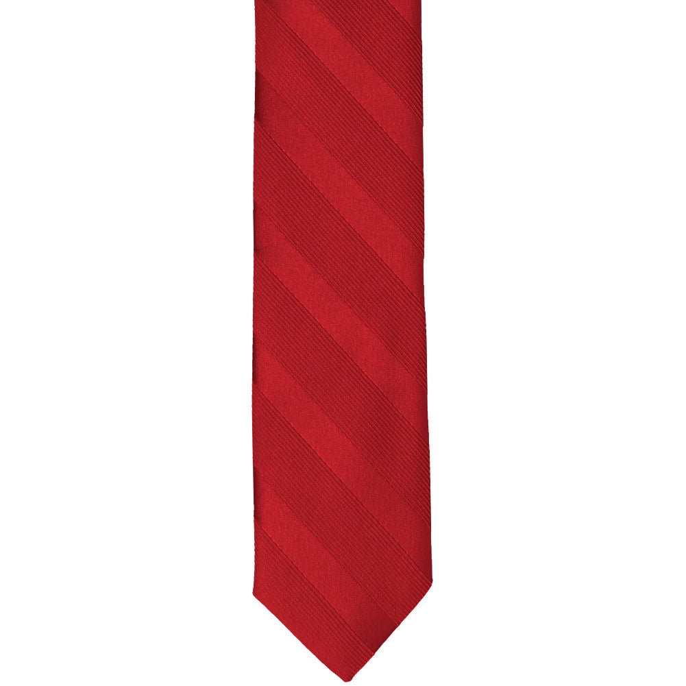 The tried and true red power tie gets a modern update with this striped skinny tie. Perfect for the young professional who wants to get noticed or a teen heading to Prom. The tone-on-tone stripes feature alternating satin and ribbed textures. Take your pick of suit colors, this one will pair well with whatever you choose. Just make sure to stick with a more fitted suit to match the skinny style of this tie. Matching pocket squares are available for formal occasions.