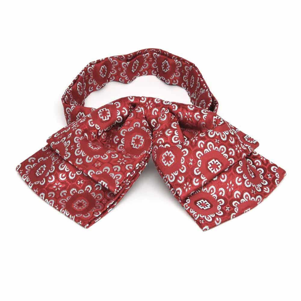 Exclusively ours! A pre-tied, red floppy bow tie in a unique and subtle floral-like design. The band collar adjusts to fit most men and women. Suited for matching women's uniform wear or men's vintage-inspired attire.