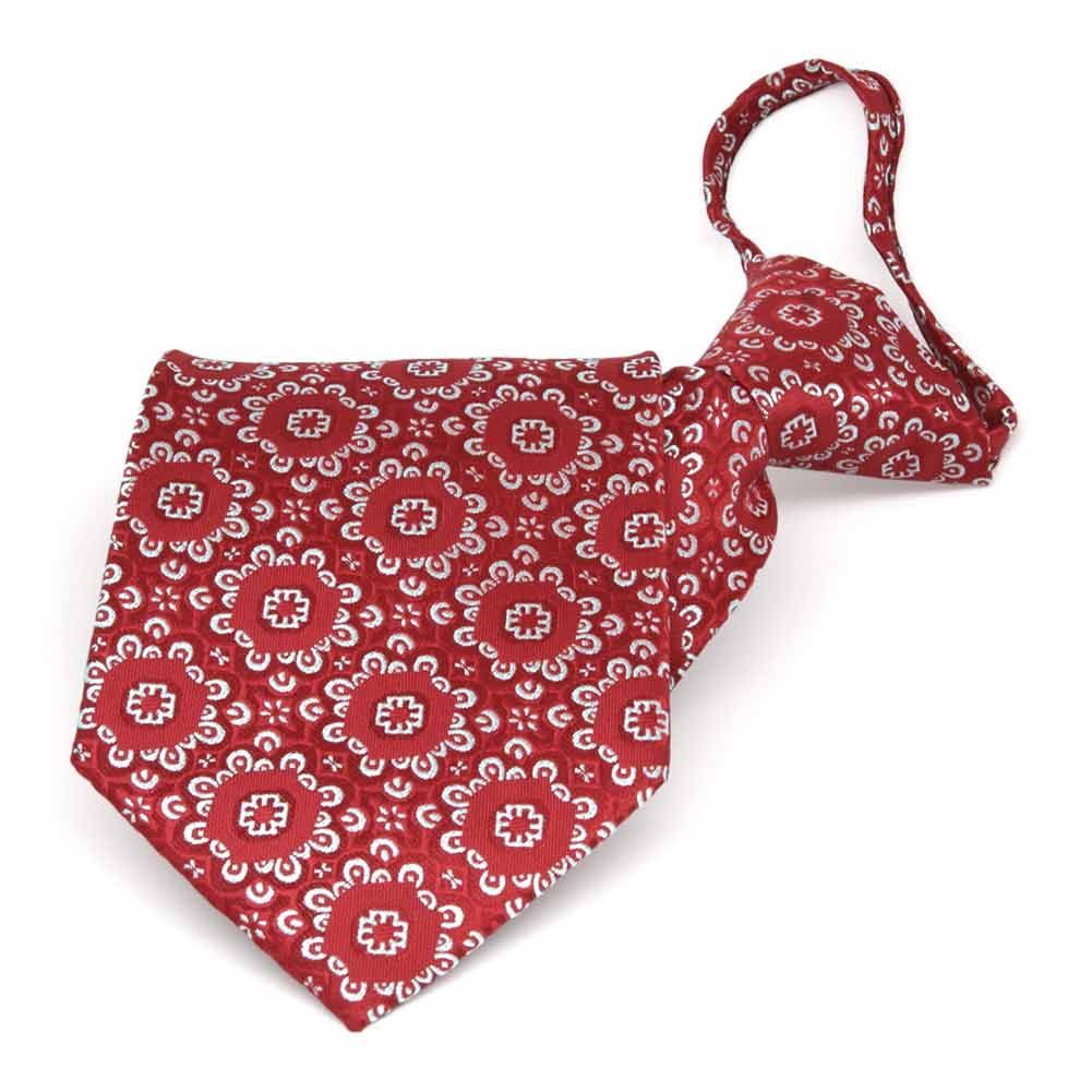 Folded front view of a red and white floral pattern zipper style tie
