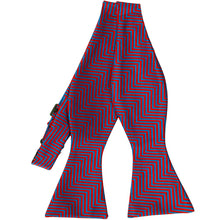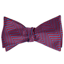 Make a bold statement with this red and blue chevron striped self-tie bow tie! Designed to turn heads, its sleek, skinny chevron pattern adds a modern edge while the vibrant color combo brings serious attention to your style. Perfect for making an impression at formal events, date nights, or stylish everyday wear, this bow tie offers both versatility and personality. The self-tie design lets you customize the fit for that perfect finishing touch. Pair it with a crisp shirt and tailored suit to effortlessly elevate your look.