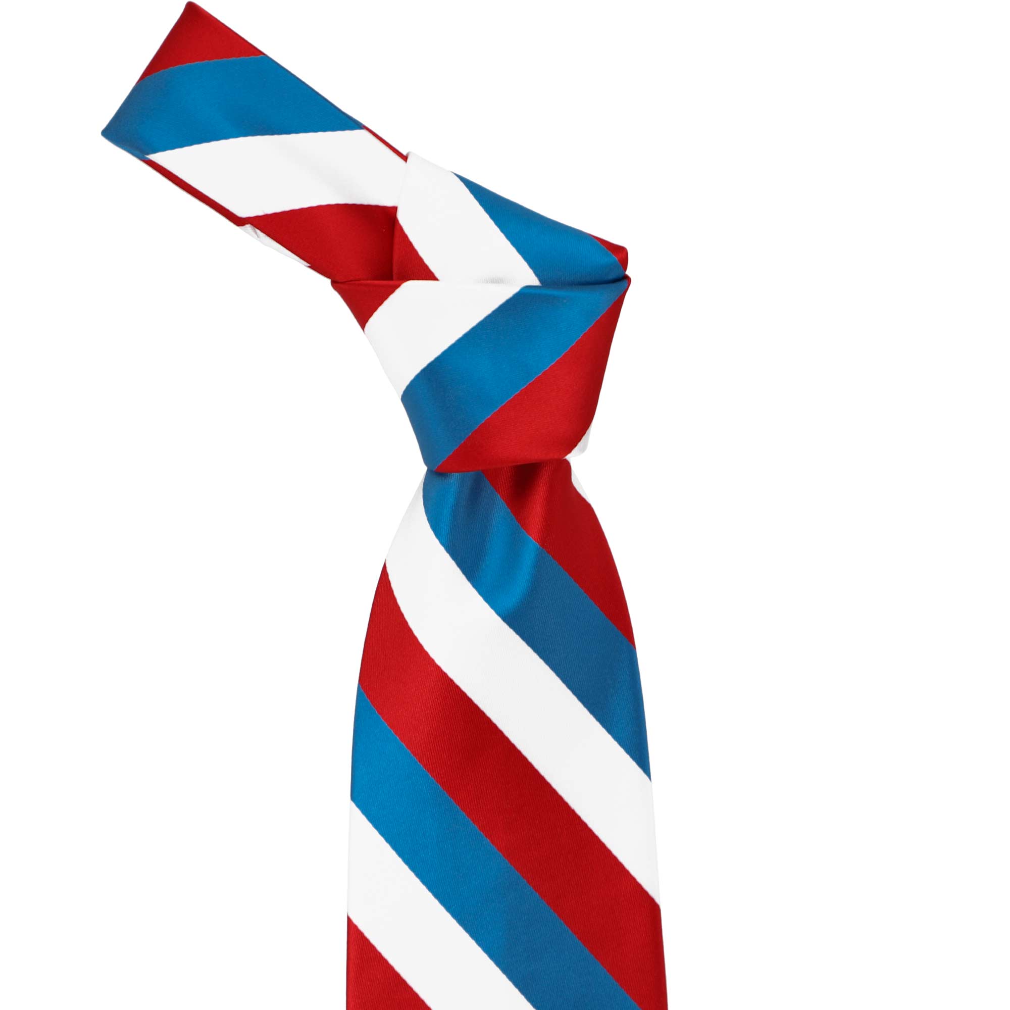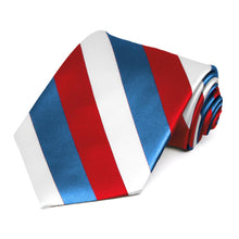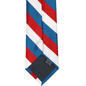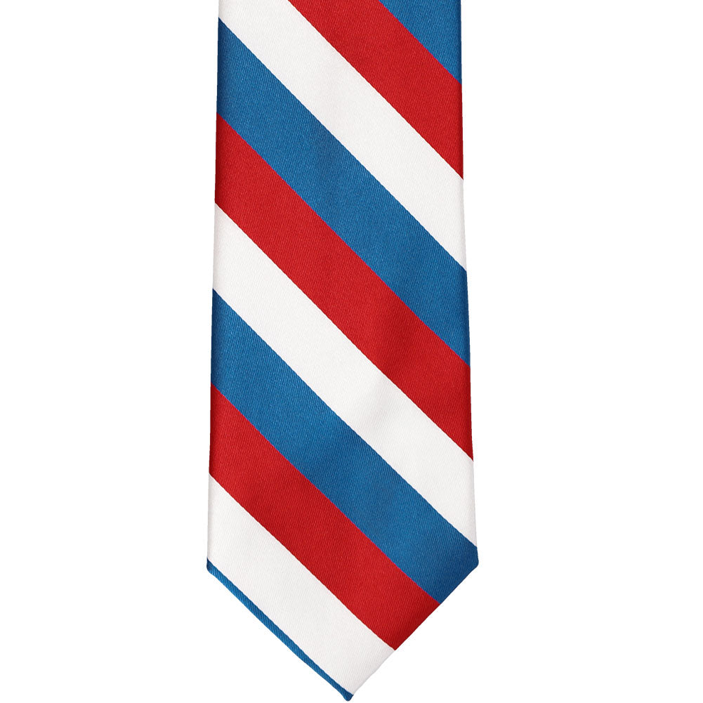 Get ready to celebrate in style with this red, medium blue and white striped tie. It's the perfect accompaniment to patriotic attire for a Fourth of July parade or that big campaign speech. The three-color stripes measure a traditional 0.75-inches for a look that draws the eye but doesn't overwhelm. Take your pick of formal or casual attire because this one goes with everything! From your best dark denim to a fitted navy blue suit, you're going to look great!