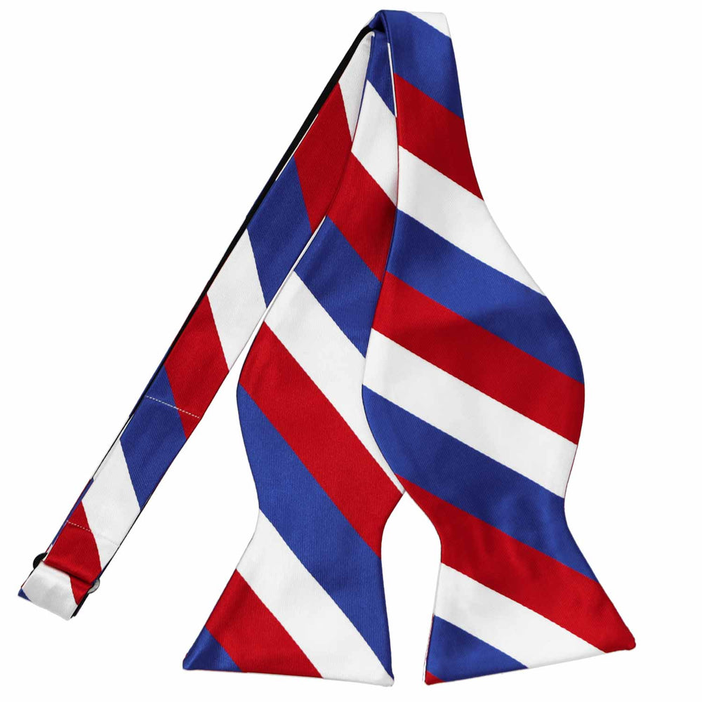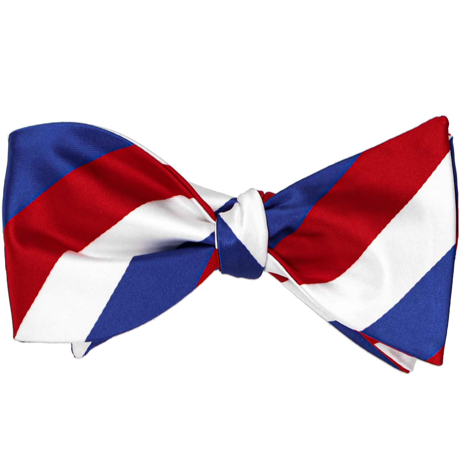 Closeup of the tied bow from a red, white and blue self-tie bow tie