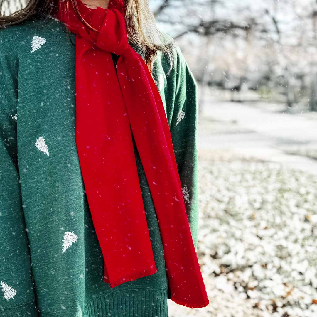 Woman wearing a red winter scarf with a holiday themed sweatshirt