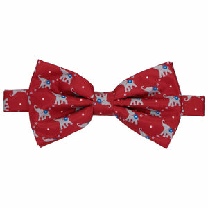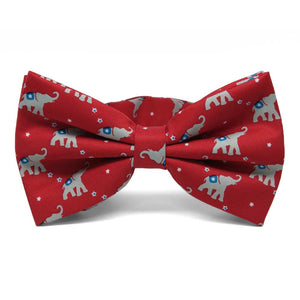 Proudly show off your political leanings in this men's republican themed bow tie. Fun but tasteful elephants stomp across the Republican red background. Add it on before you head to that next campaign or use it for group wear. We have large quantities in stock. Matching pocket squares are sold separately for those suit-wearing occasions.