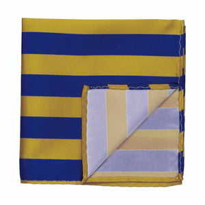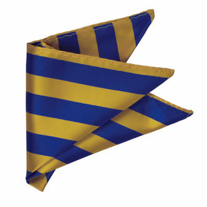 This royal blue and gold striped pocket square measures a large, 12-inches by 12-inches to suit a wide variety of folds. The tightly woven material creates a smooth finish for a sharp look. Matches our royal blue and gold striped ties, skinny ties and bow ties.