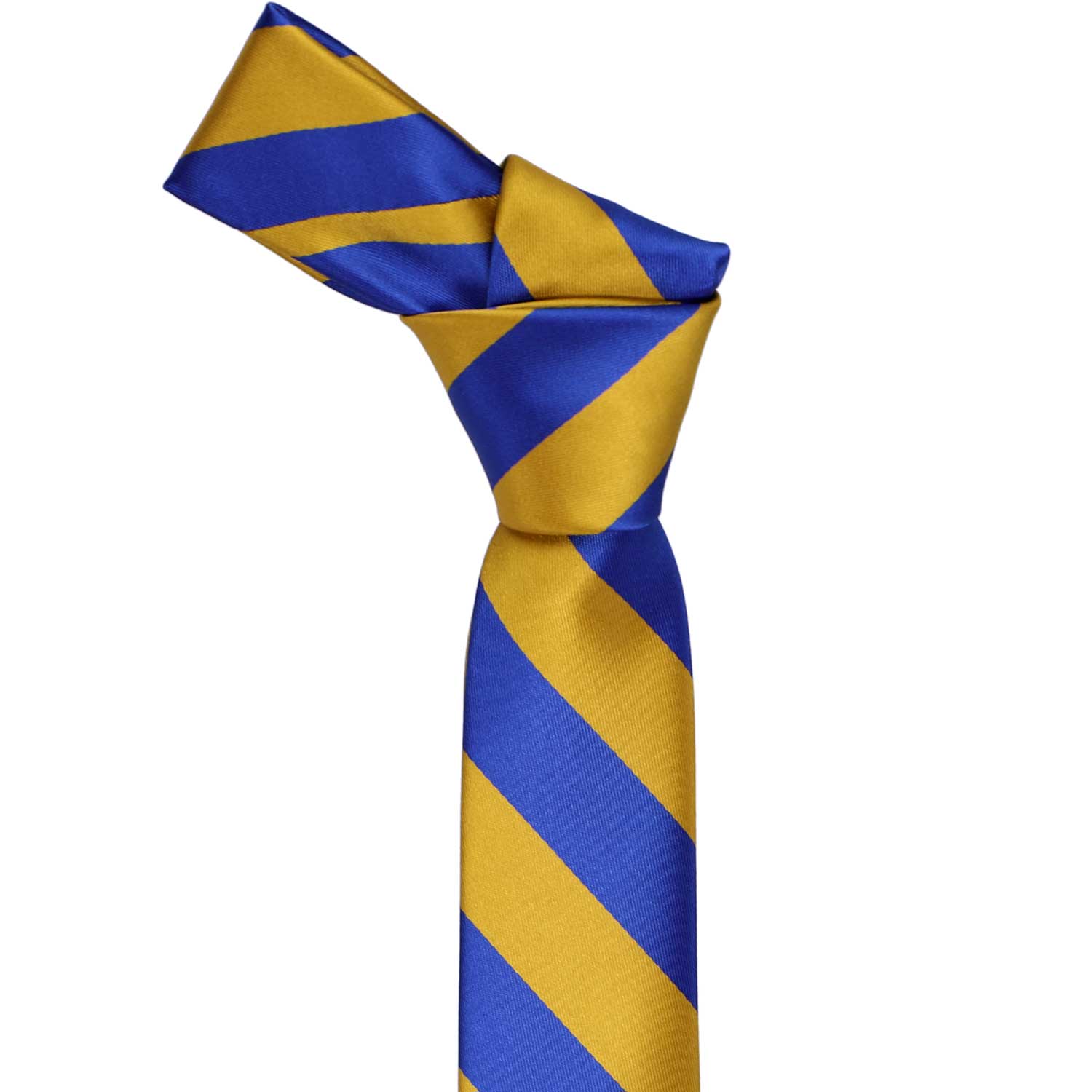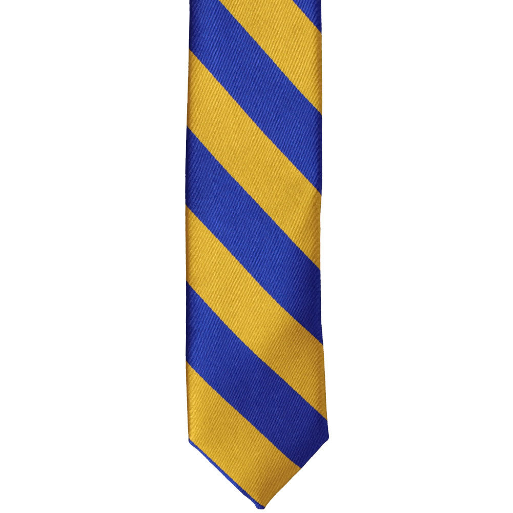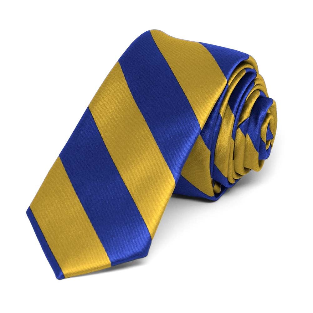 Our most popular striped ties are now available in a trendy, 2-inch width. This skinny royal blue and gold striped tie is made from heavyweight woven material with a smooth, satin finish. More styles and sizes of neckwear and pocket squares available in this color combo.