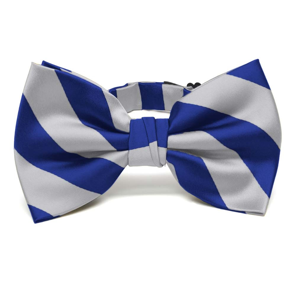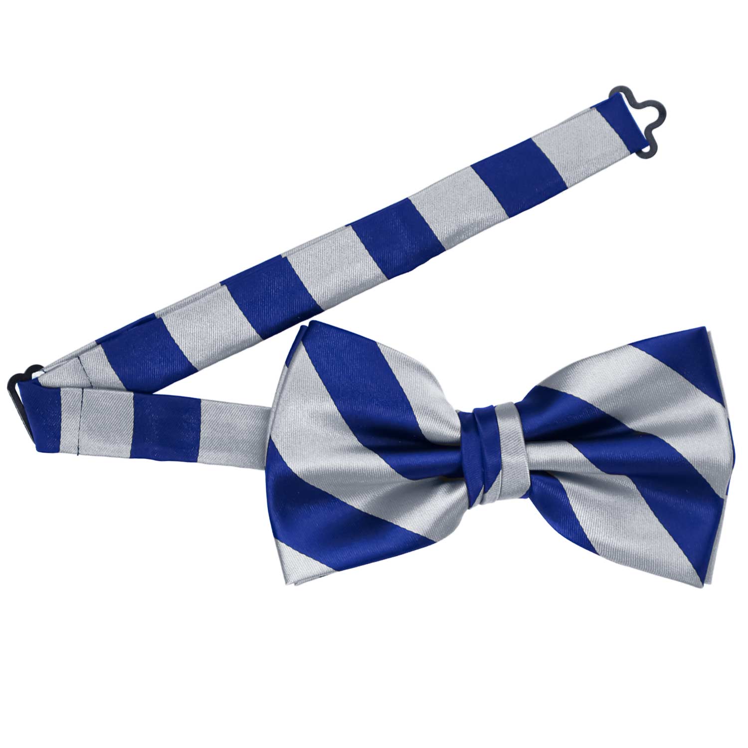 This royal blue and silver striped bow tie features a pre-tied, band collar that expands to fit neck sizes up to 19-inches. Made from all polyester microfiber, it is designed to match our bestselling men's royal blue and silver striped tie. Matching pocket squares are available for purchase.