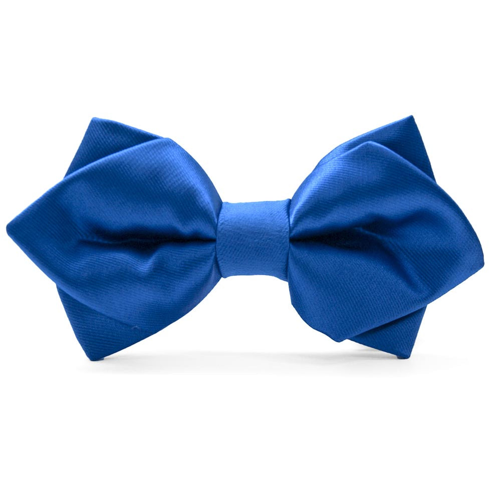 You'll look modern and sharp in this royal blue diamond tip bow tie. It features diamond tips in the front and traditional bow tips in the back. The bow tie attaches securely around the neck via an adjustable band that expands to fit neck sizes from 12 to 21-inches. It's made from heavyweight woven material with slight ribbing. See related products below for matching pocket squares.