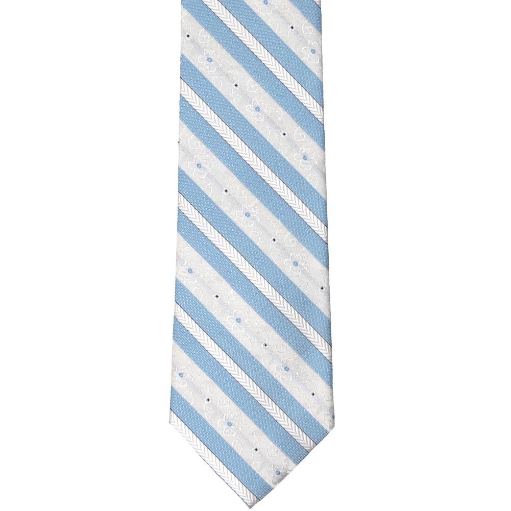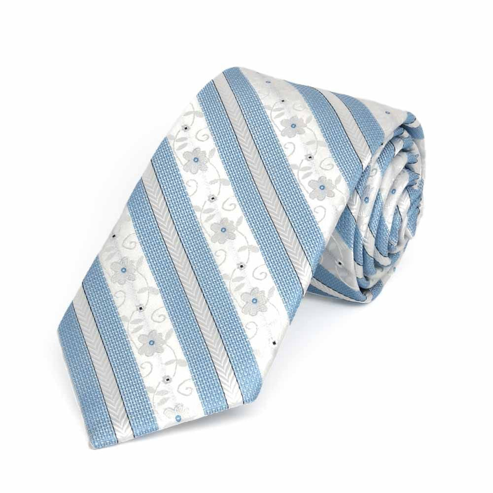 Brighten up your look with this slim floral striped necktie, perfect for sunny days and blue skies. Add a pop of color to your everyday workwear or wear it to complement a light blue-themed wedding. The soft color palette pairs beautifully with lighter suits, like light gray or tan. Complete the ensemble with the matching pocket square, sold separately, for a polished finishing touch.