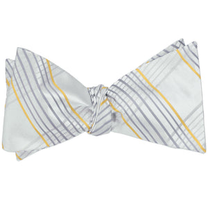 Gray and yellow plaid self-tie bow tie, untied flat front view