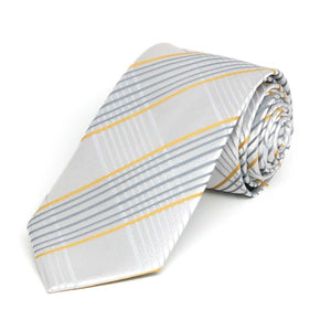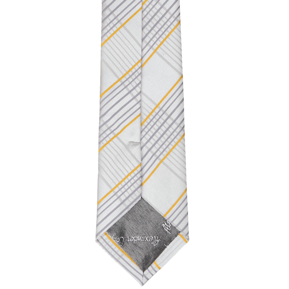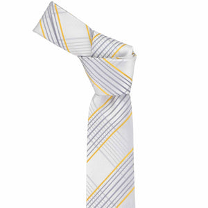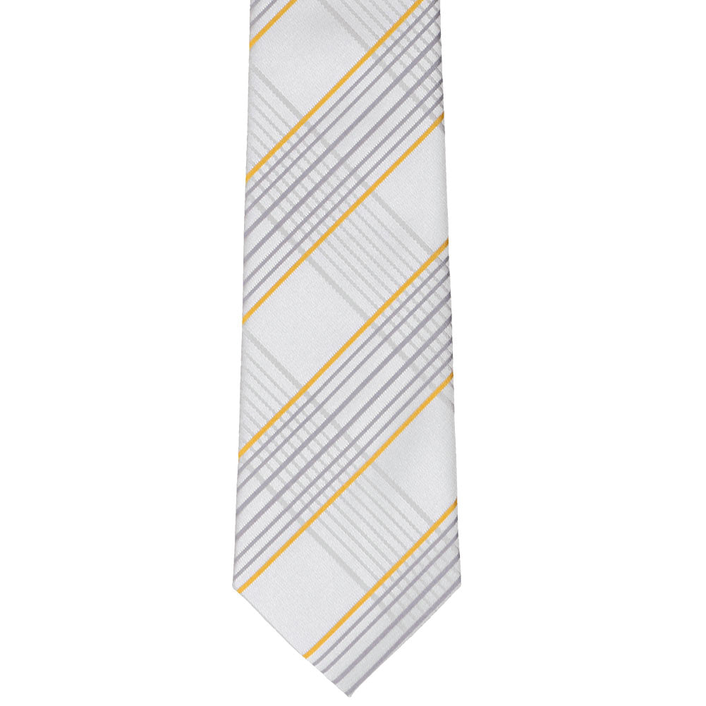 Shake up your style with this timeless slim gray plaid tie. Subtle hints of gold and silver weave through the large plaid design, creating a sophisticated yet understated look. The bold pattern adds interest without overpowering your outfit, making it ideal for both formal and casual occasions. Heading to a wedding? Pair it with a dark gray or black suit for a sharp and polished ensemble that will have you looking like the best-dressed guest in the room.