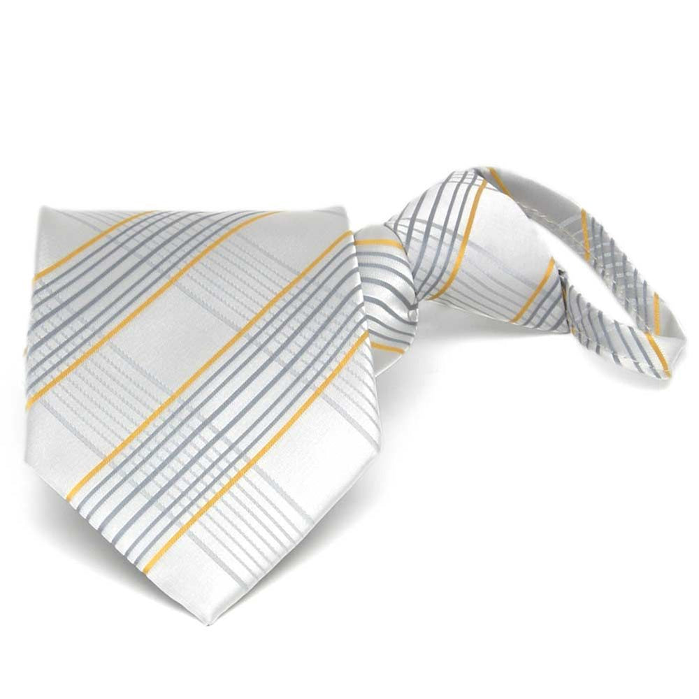 A true classic with a modern twist! This soft gray plaid zipper tie features subtle hints of gold and silver, creating an eye-catching yet refined look. The large plaid pattern makes a statement without overpowering your outfit, making it a versatile choice for both formal and casual occasions. Attending a wedding? Pair it with a dark gray or black suit for a polished, distinguished look. And with its pre-tied zipper design, you’ll always have a perfect knot—no fuss required!