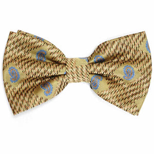 Make a statement with this gold paisley bow tie. Made from heavyweight woven material. Great for a bold, everyday look. The bow tie is pre-tied with a band collar that expands to fit most adults.