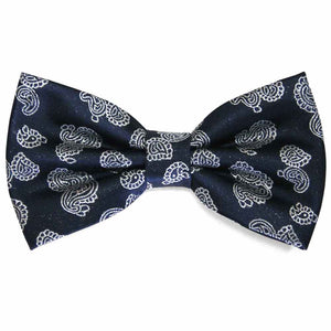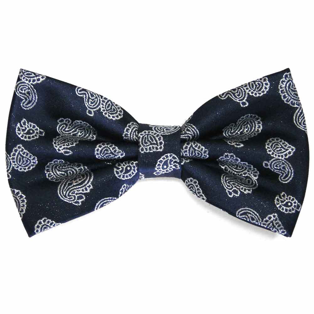 This navy blue special purchase bow tie is available while supplies last. The silver paisley design is accented with Lurex threads for a shiny, metallic look. Perfect for formalwear or a night out. The bow tie is pre-tied with a band collar that expands to fit most adults.
