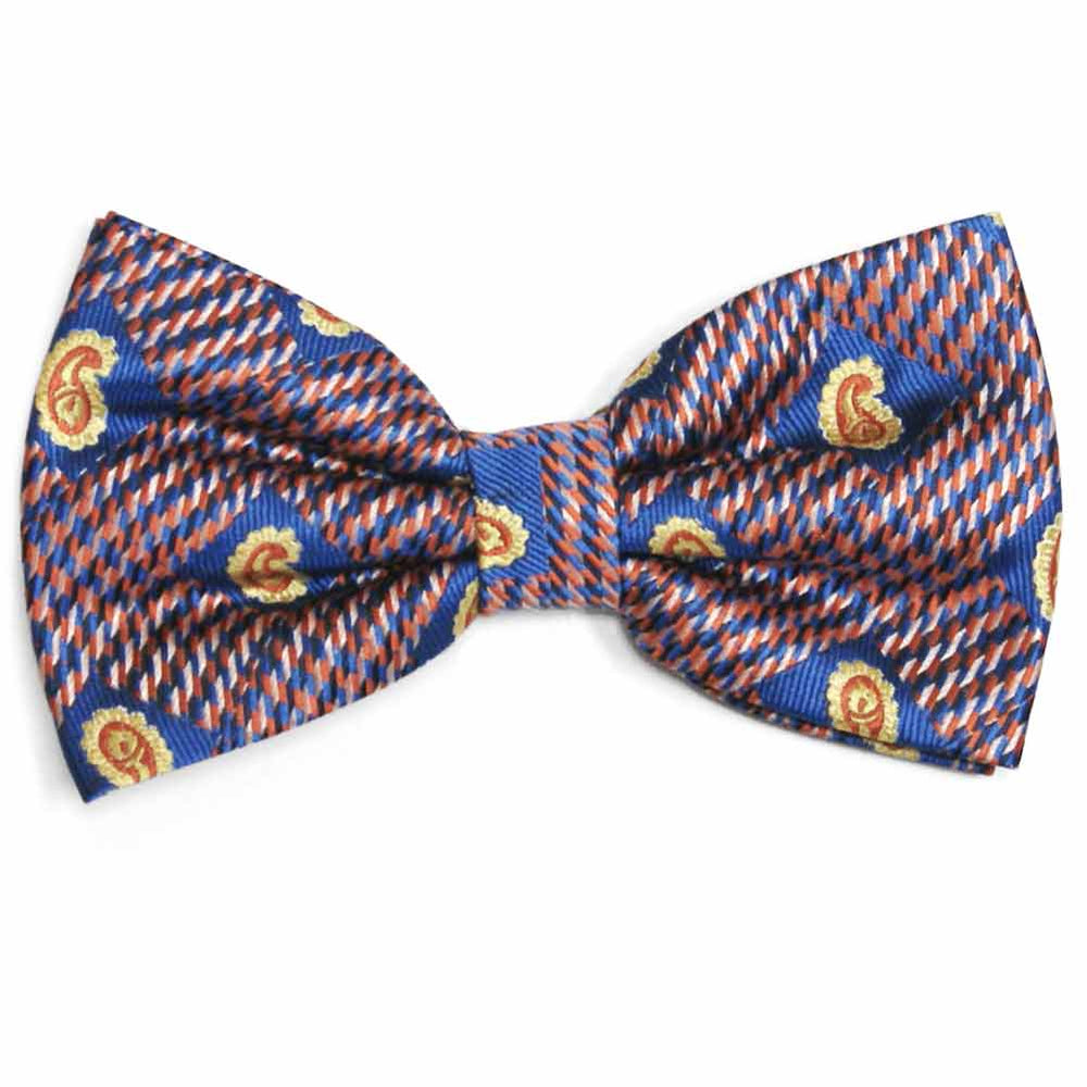 The perfect complement to your evening attire. This royal blue and orange paisley bow tie is made from heavyweight woven material. The bow tie is pre-tied with a band collar that expands to fit most adults. Purchase the matching pocket square to complete your look. This special purchase bow tie is available while supplies last.