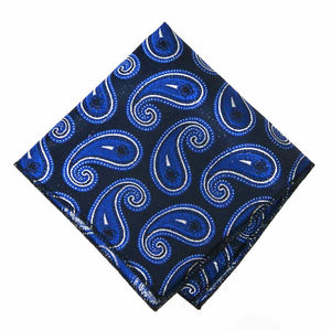 This royal blue special purchase pocket square is available while supplies last. The silver paisley design is accented with Lurex threads for a shiny, metallic look. Perfect for formalwear or a night out. This pocket square is one-sided and measures 10-inches by 10-inches.