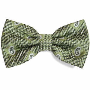 This sage green paisley bow tie is made from heavyweight woven material. Great for a bold, everyday look. The bow tie is pre-tied with a band collar that expands to fit most adults. This special purchase bow tie is available while supplies last.